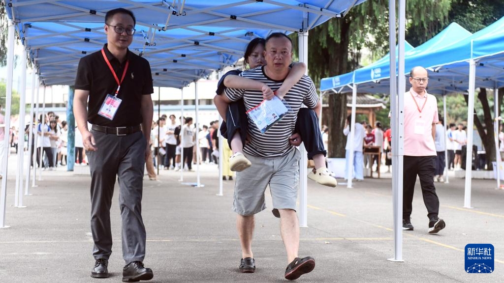 6月7日,一名家长在背送女儿进入广西三江侗族自治县三江中学考点。