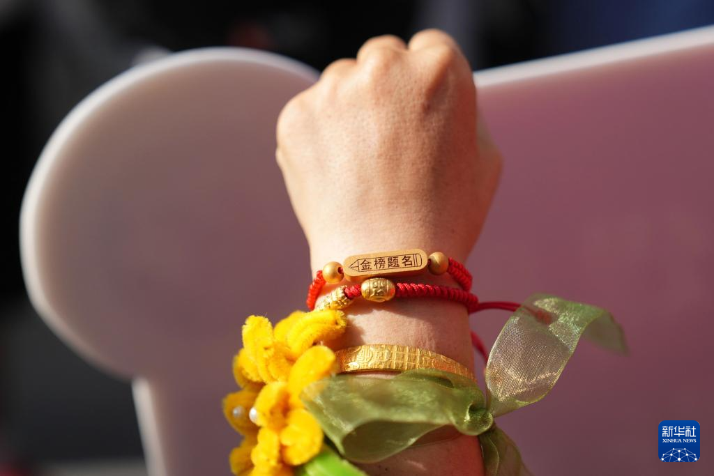 6月7日,在北京市陈经纶中学考点外,送考老师佩戴着“金榜题名”的手链为考生加油。