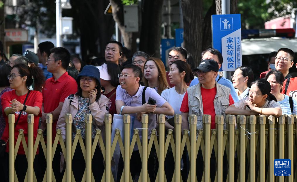 6月7日,考生家长在北京师范大学附属实验中学考点外等候。