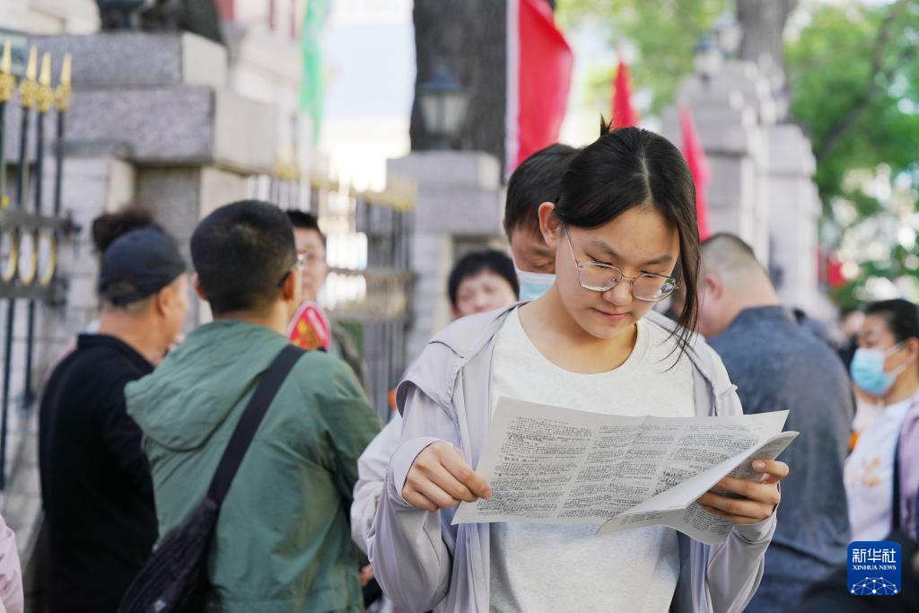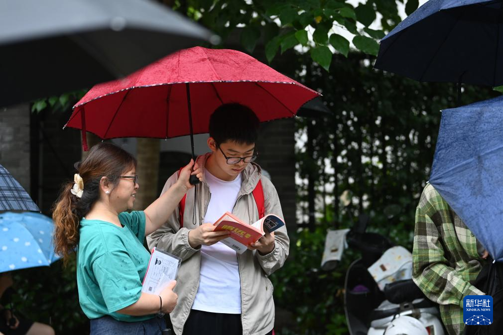 6月7日,在黑龙江哈尔滨市第九中学考点外,考生抓紧时间进行复习。