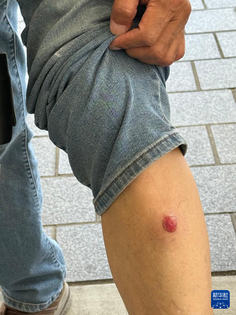 6月8日,在美国加利福尼亚州洛杉矶市中心,一名新华社摄影报道员左腿被警方橡皮子弹击中后出现红肿伤痕。