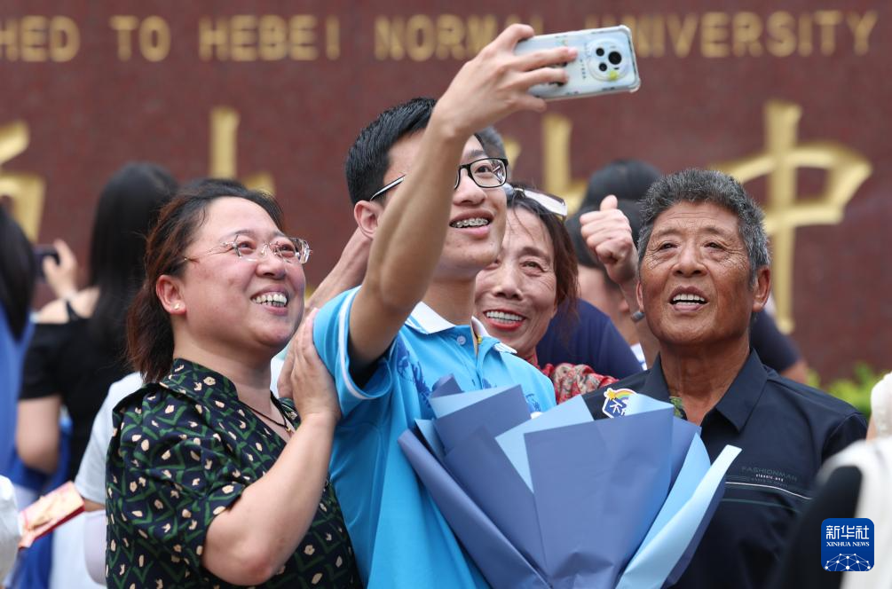6月9日,在河北省石家庄市师大附中考点,结束考试的考生和家人合影留念。