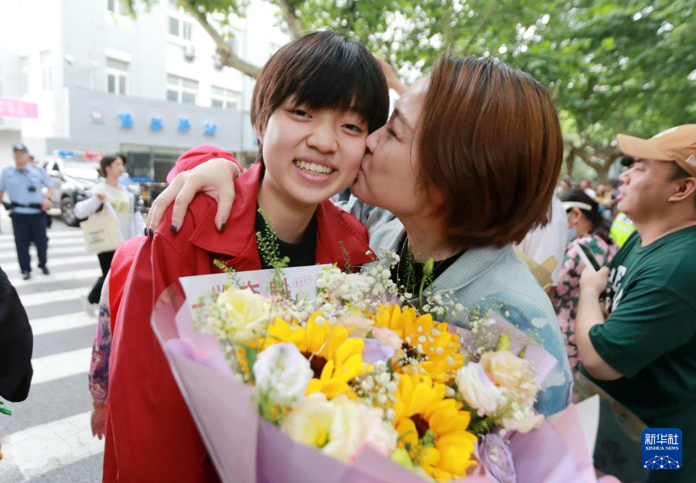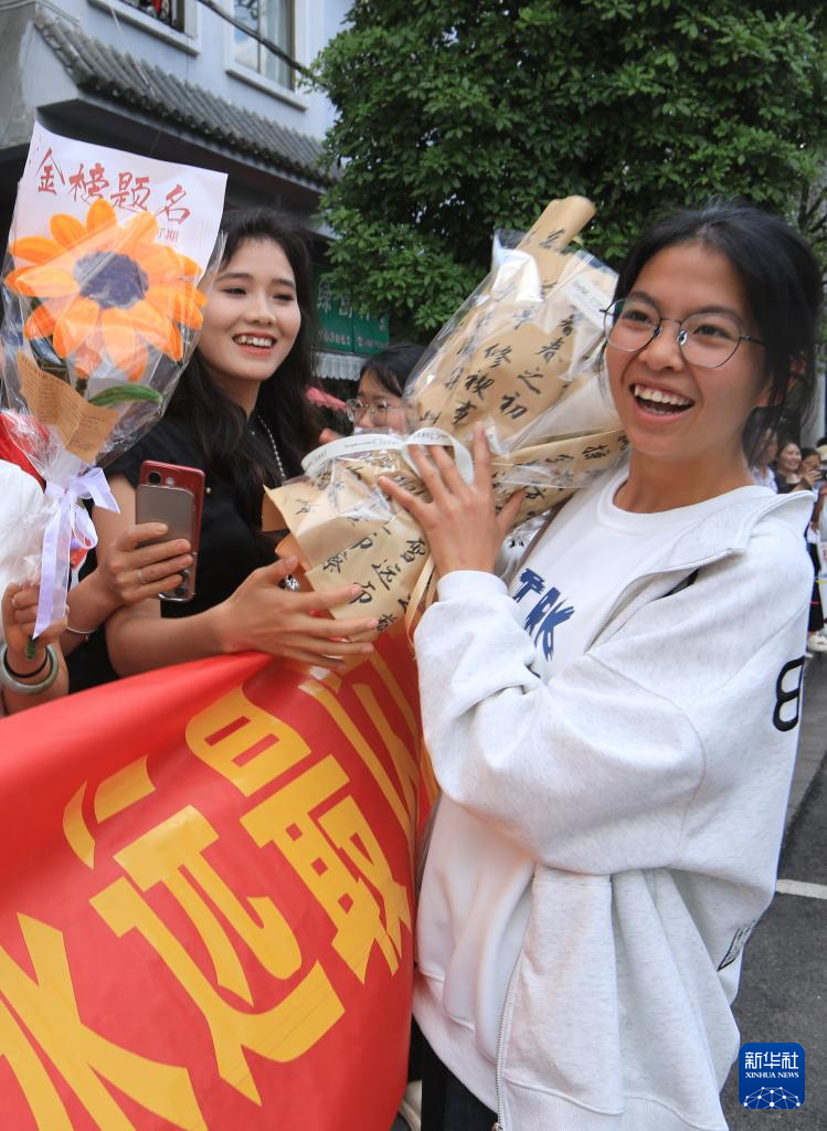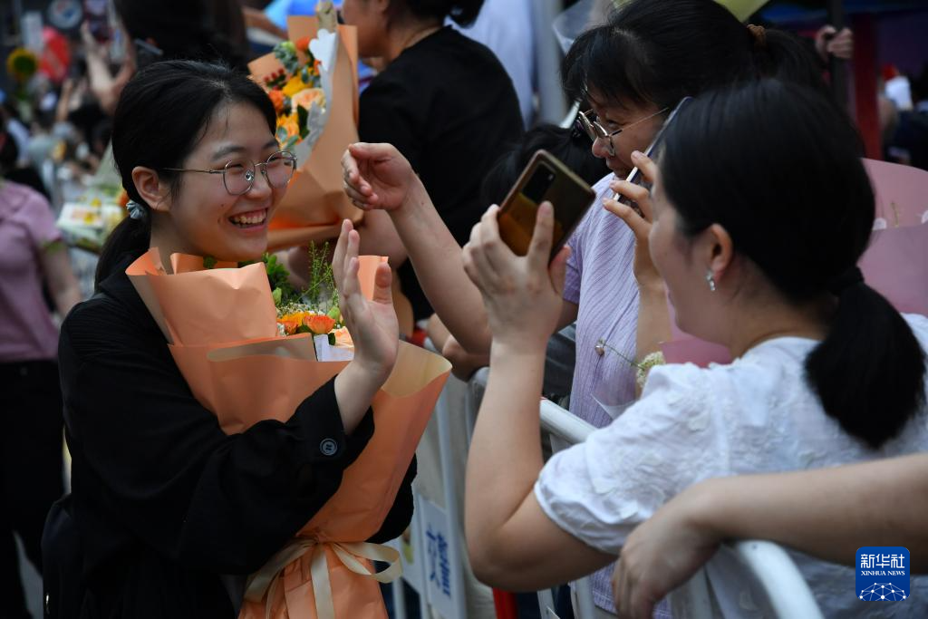 6月9日,在河北省秦皇岛市第一中学考点,结束考试的考生收到鲜花。