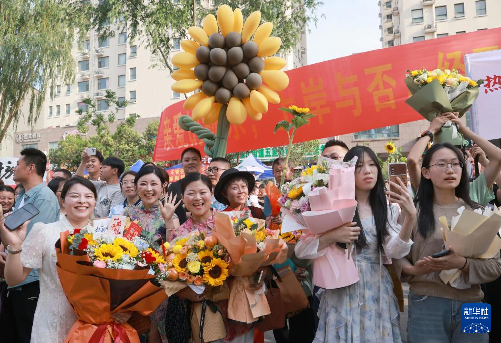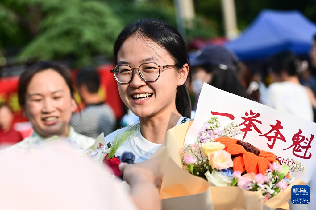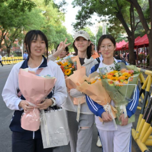 6月10日,在山东青州第一中学考点,结束考试的考生收到鲜花。