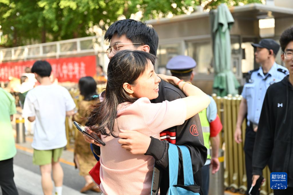 6月10日,在北京市第八中学考点外,母亲拥抱考完的儿子。