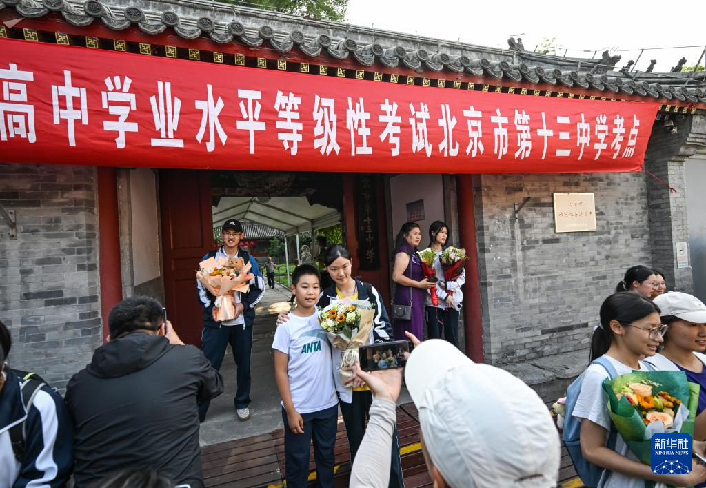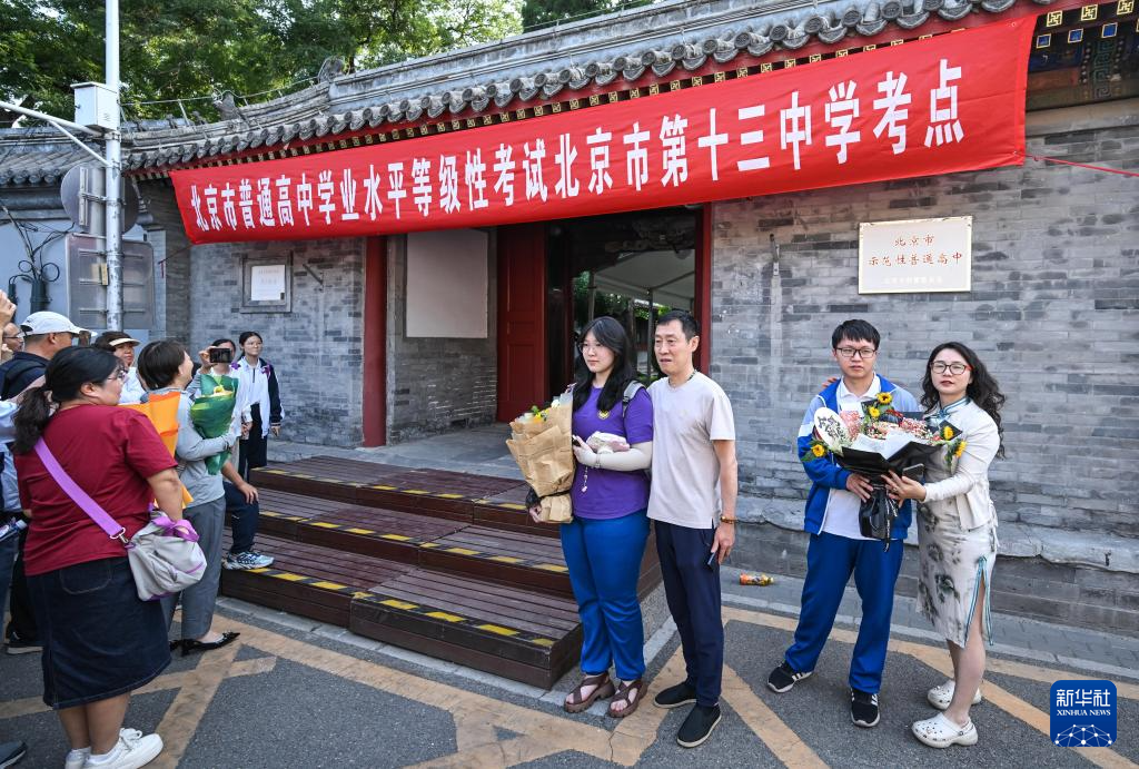 6月10日,考生和家人在北京市第十三中学考点外留影。