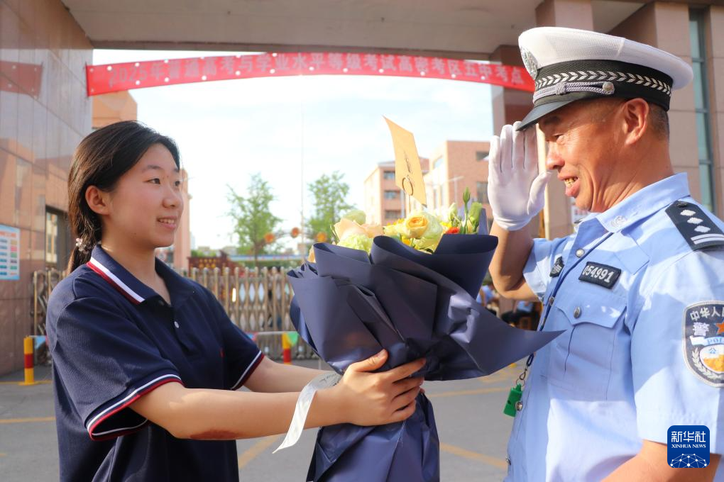 6月10日,在山东省高密市第五中学考点,考生向执勤交警表达感谢。