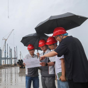 6月10日,在东方特钢镍铬新材智造项目建设现场,嘉兴市南湖区驻企“红色专班”党员(右一、右二)与企业施工方一起查看项目现场推进情况。