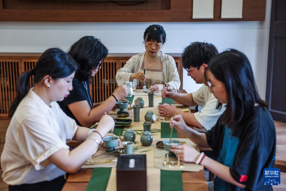 6月10日,游客在子城欢喜书店“江湖书局”民艺巷沉浸式体验传统掐丝珐琅技艺。