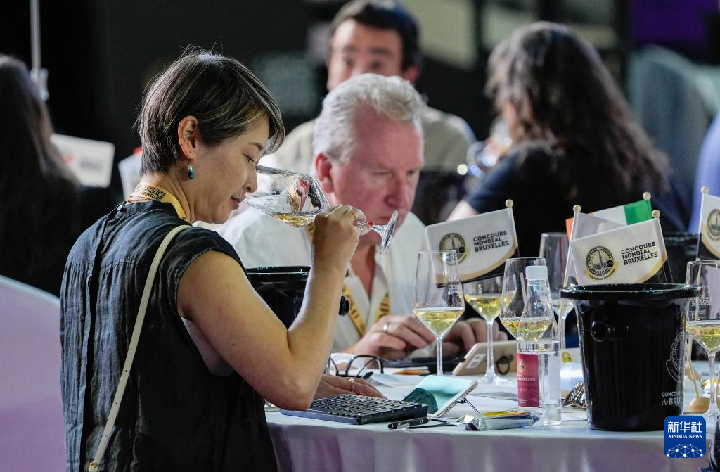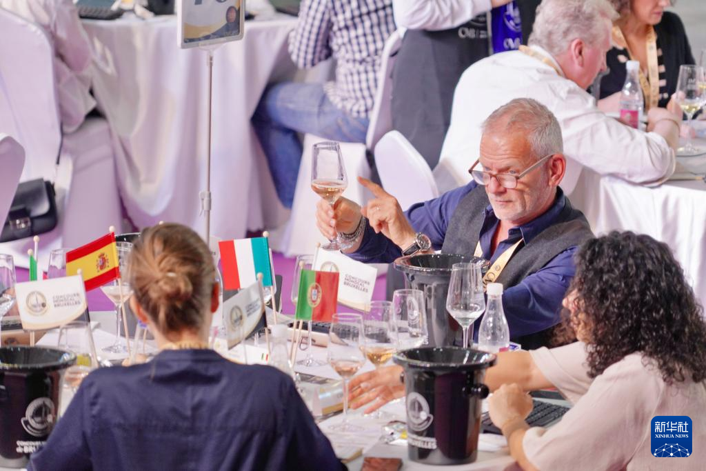 6月10日,在宁夏银川举办的第32届布鲁塞尔国际葡萄酒大奖赛上,品酒师在品鉴参赛葡萄酒。