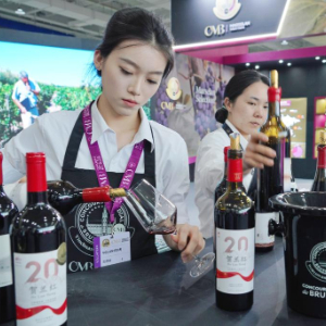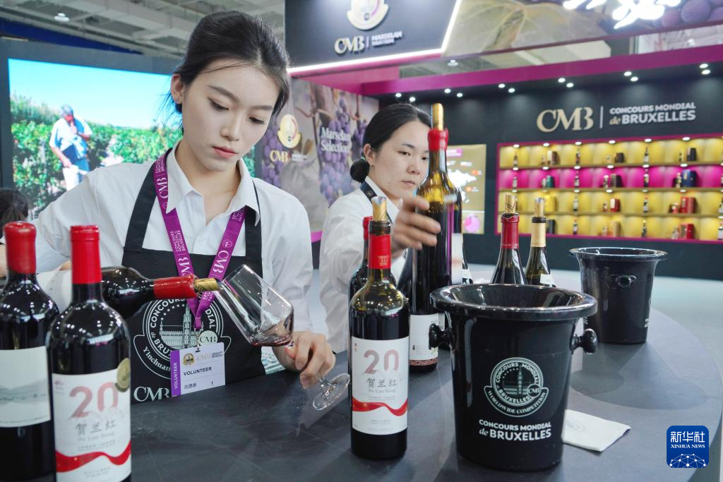 6月10日,在宁夏银川举办的第32届布鲁塞尔国际葡萄酒大奖赛现场,志愿者在展示区为来宾提供宁夏贺兰山东麓产区葡萄酒。