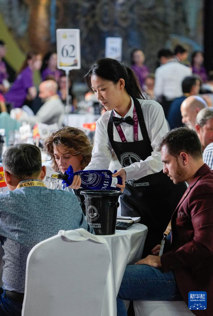 6月10日,在宁夏银川举办的第32届布鲁塞尔国际葡萄酒大奖赛上,工作人员为品酒师倒酒,参赛葡萄酒经过统一套袋包装后由品酒师进行盲评。