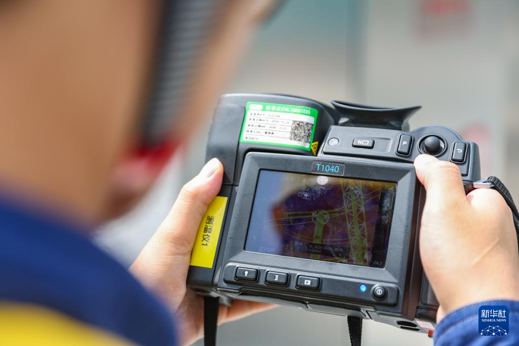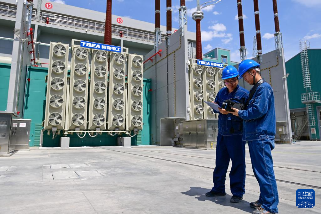 6月10日,在哈密—重庆±800千伏特高压直流输电工程新疆送端站——巴里坤换流站,运检人员在换流变区域进行红外检测工作。
