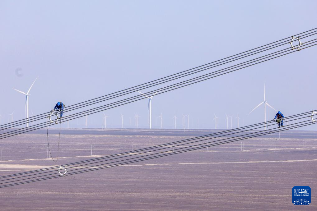 在新疆哈密市,电力员工对哈密—重庆±800千伏特高压直流输电工程进行走线检查(4月8日摄,无人机照片)。