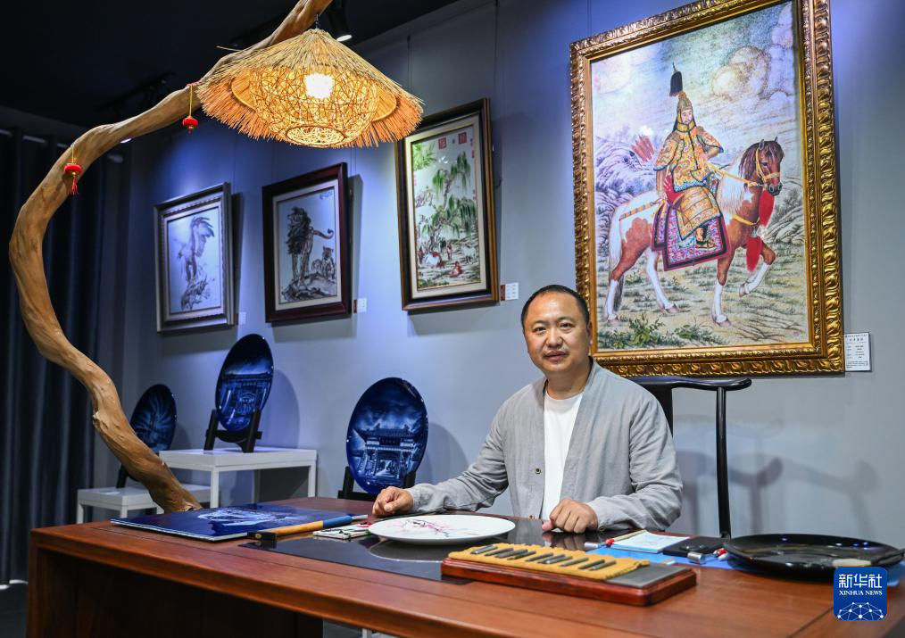 在江苏盐城大丰瓷刻展示馆,陈银付在为瓷刻作品赋色(6月6日摄)。