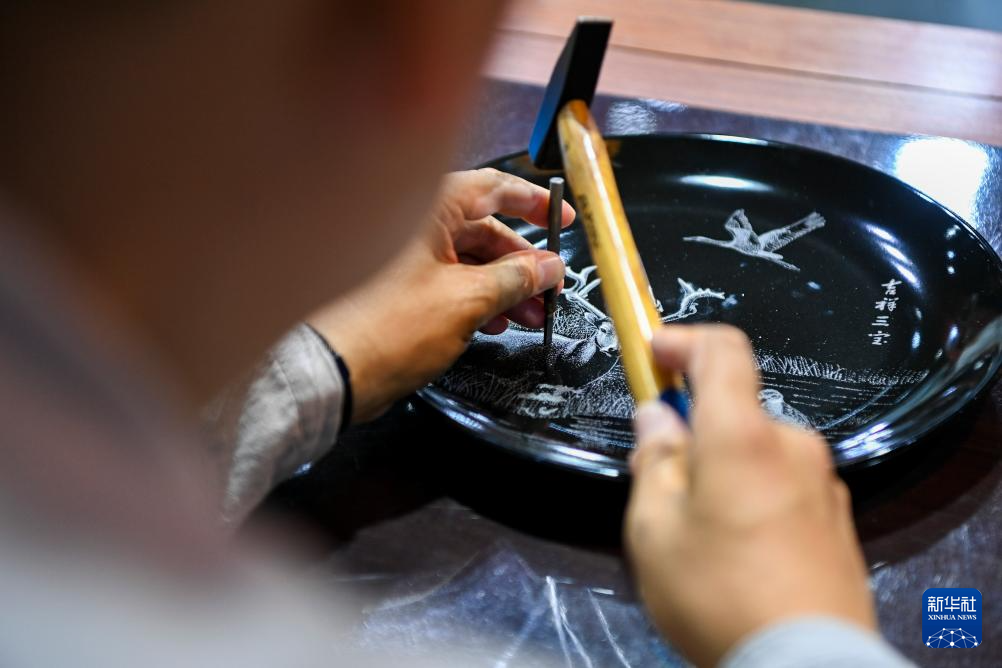 6月6日,在江苏盐城大丰瓷刻展示馆,陈银付进行瓷刻创作时挑选合适的钢凿。