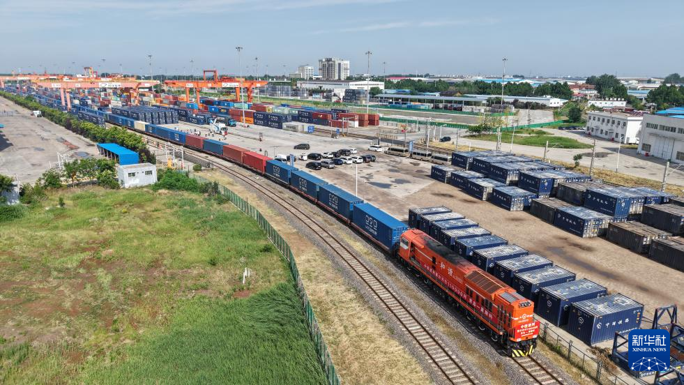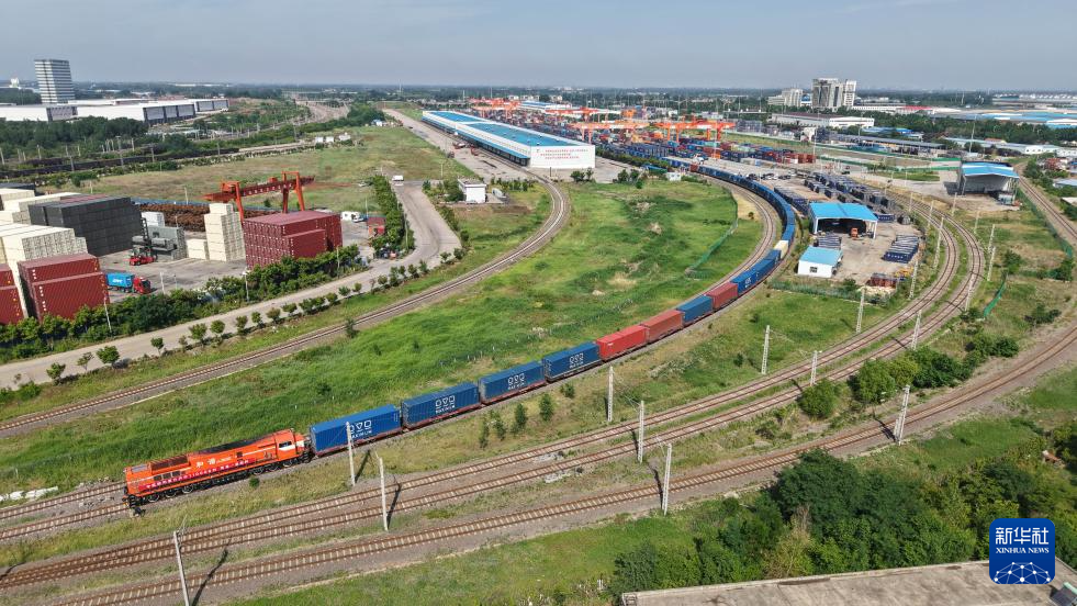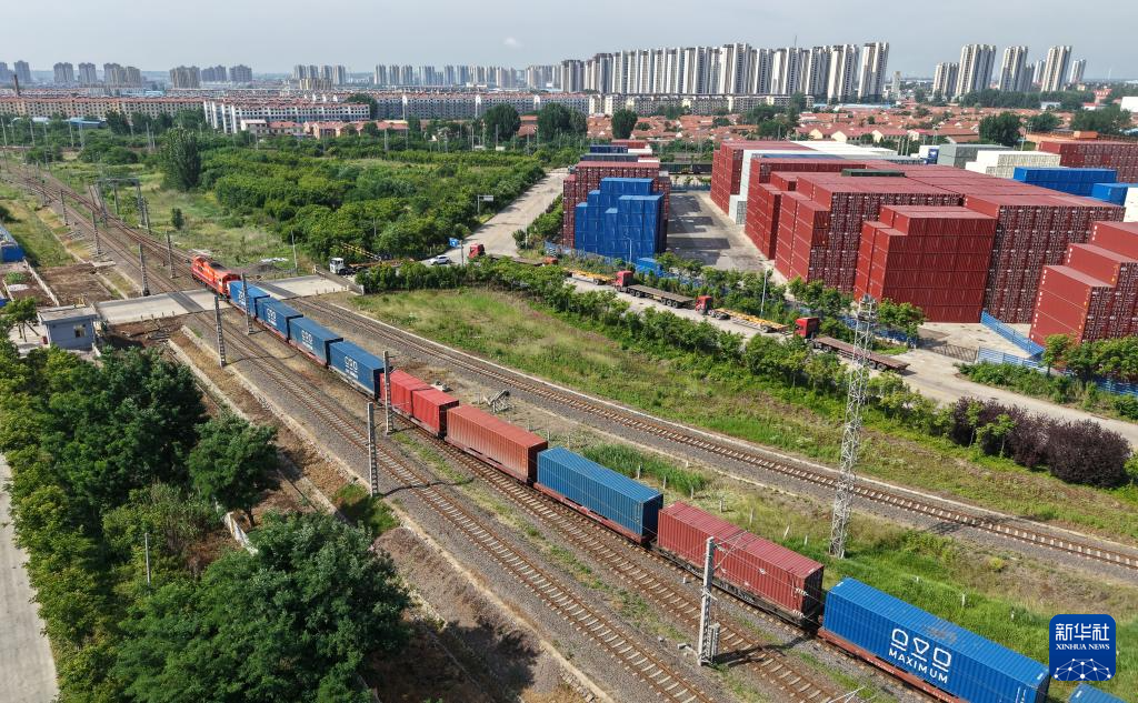 6月10日,75052次中欧班列从青岛胶州站缓缓驶出(无人机照片)。
