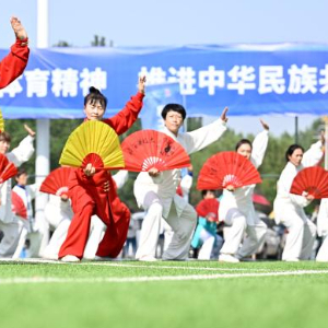 6月10日,群众在活动上参加千人健身操展演(无人机照片)。