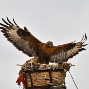 在羌塘草原, 一只游隼飞离鹰架上的巢(6月7日摄)。