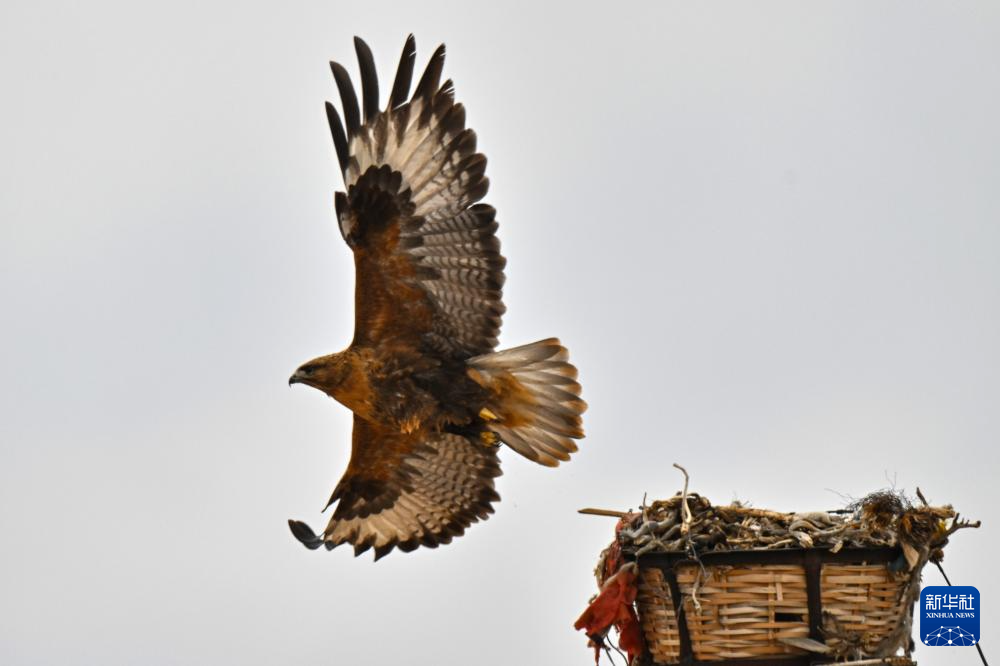 羌塘草原上的一只大鵟飞离鹰架上的巢(6月8日摄)。