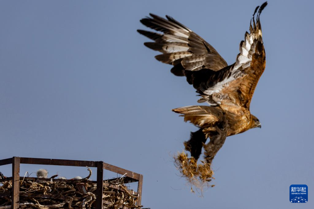 在羌塘草原上,一只游隼飞离鹰架上的巢(6月8日摄)。