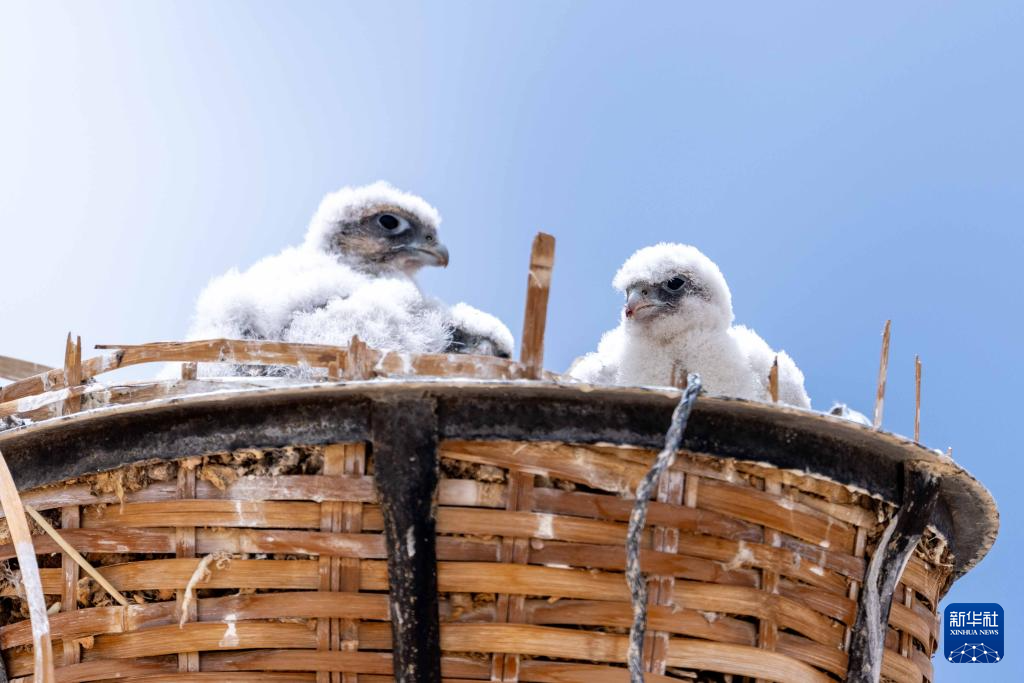 6月7日拍摄的在鹰架上巢中栖息的游隼雏鸟。