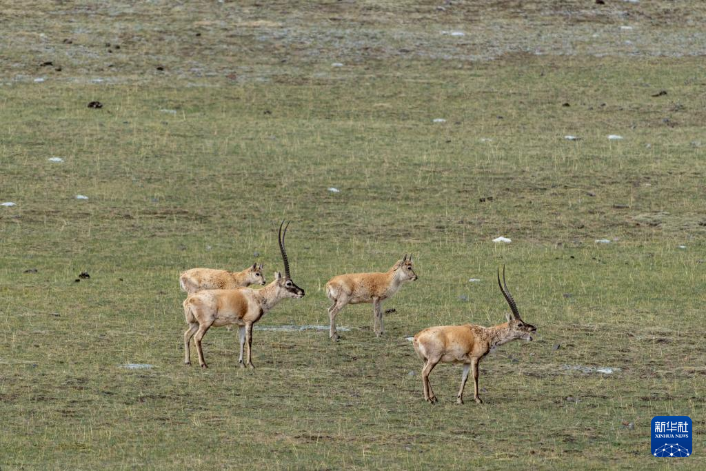 在羌塘国家级自然保护区核心区拍摄到的雄性和亚成体雌性藏羚羊(6月9日摄)。