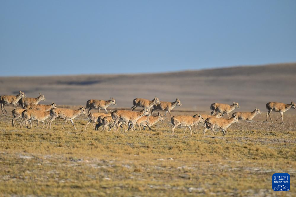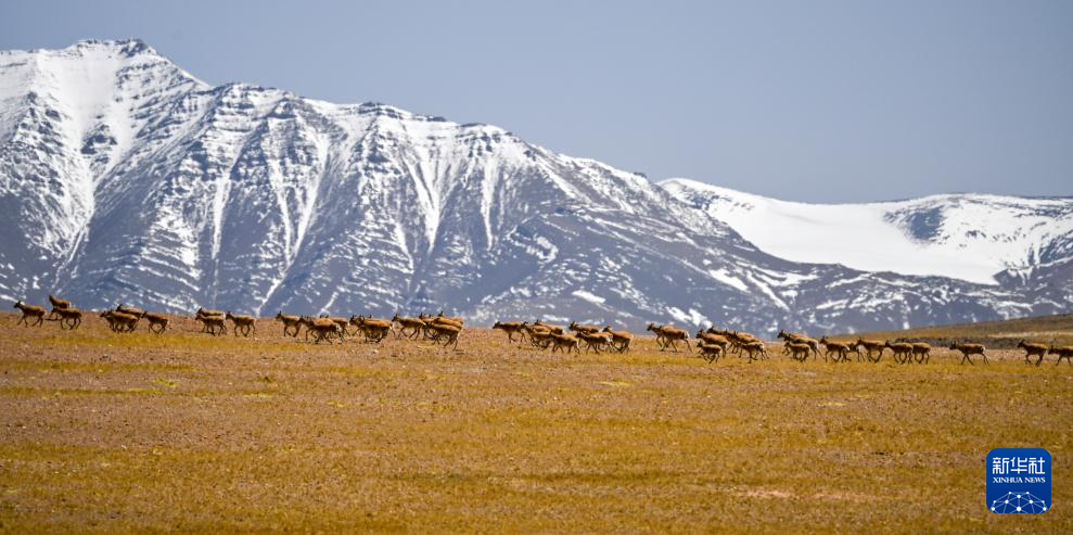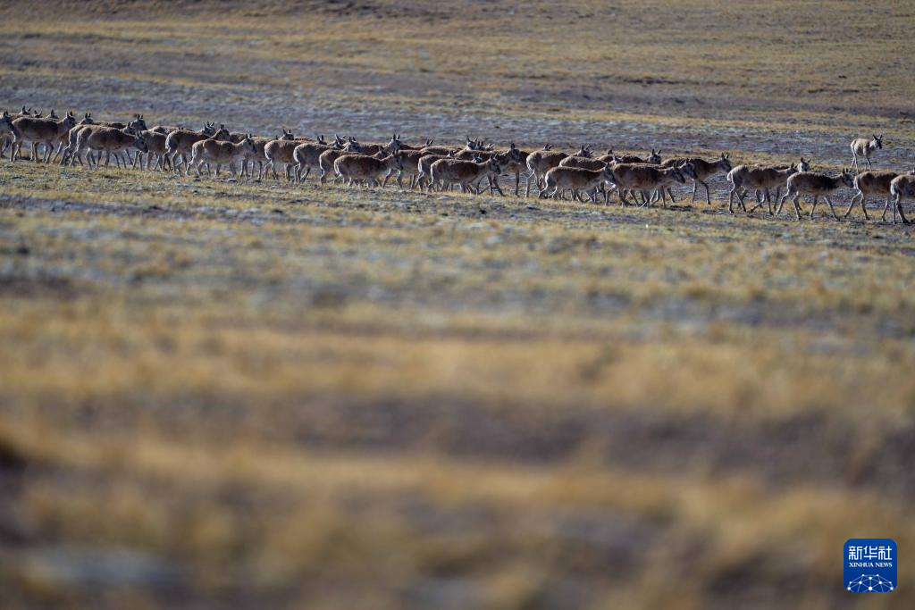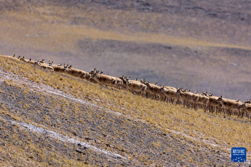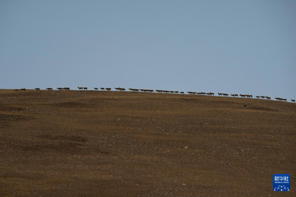 羌塘国家级自然保护区核心区繁殖迁徙路上的雌性藏羚羊群。(6月10日摄)。