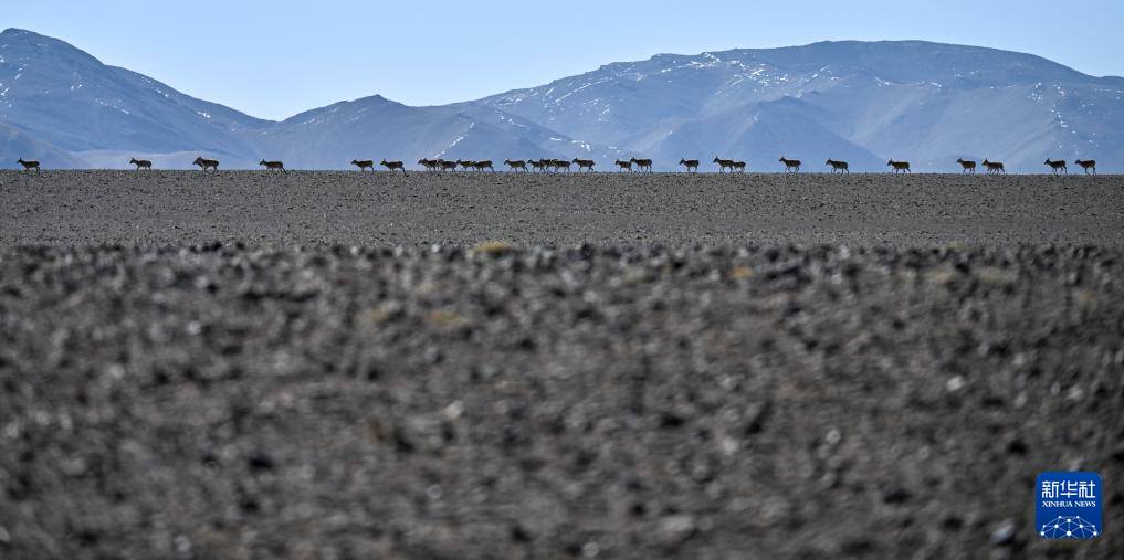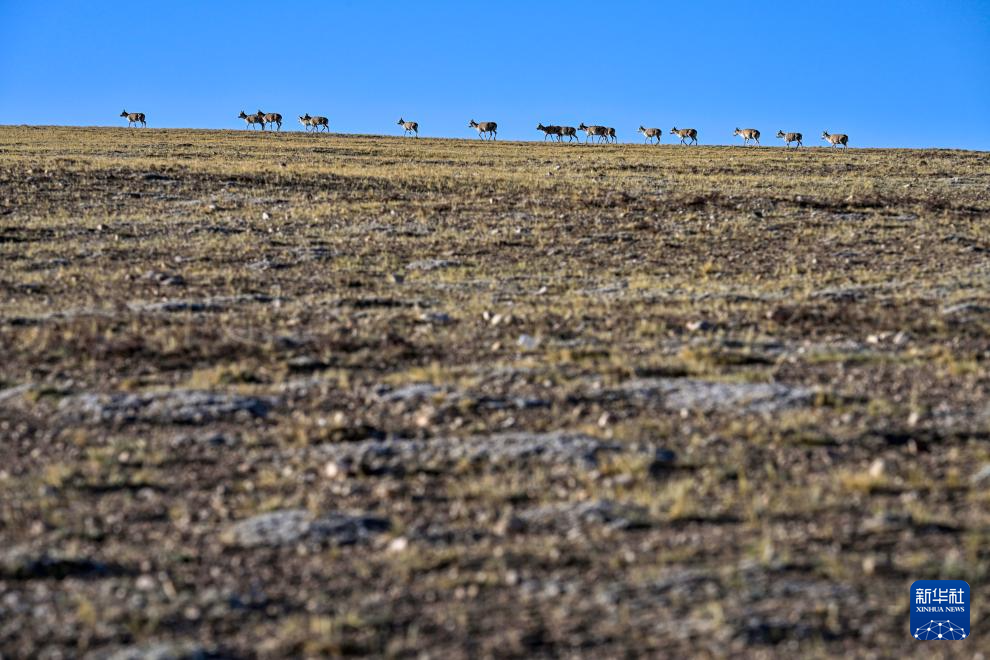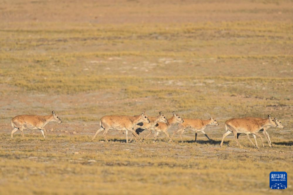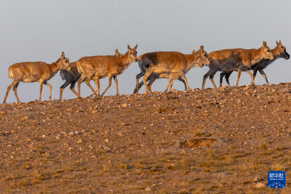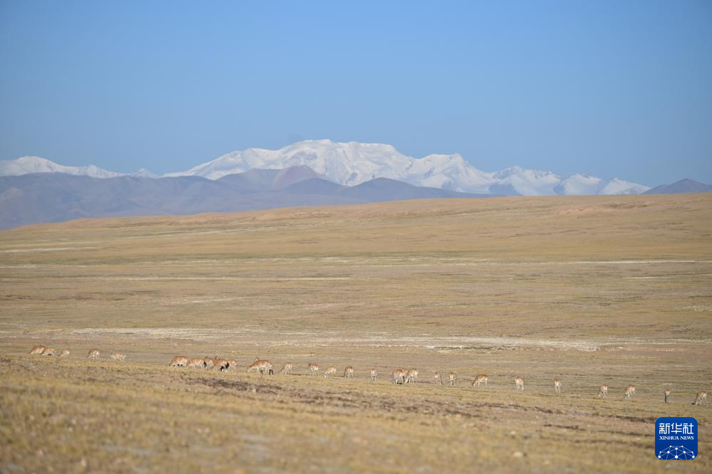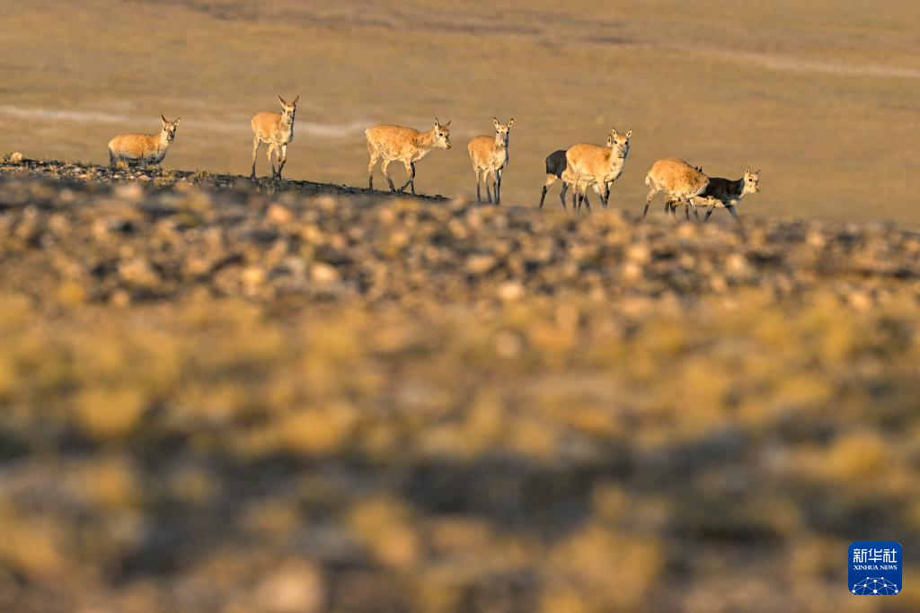 羌塘国家级自然保护区核心区繁殖迁徙路上的雌性藏羚羊群。(6月10日摄)。