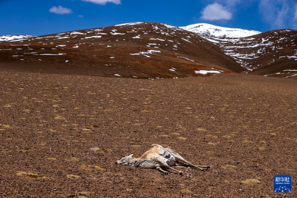 一头雌性藏羚羊在羌塘国家级自然保护区核心区繁殖迁徙的路上死于狼口(6月8日摄)。
