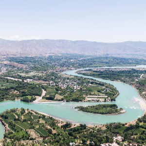 高原夏日,青海省黄南藏族自治州尖扎县境内的黄河碧波荡漾。蓝天白云、清清河水和岸边村落共同构成秀丽的夏日美景。
