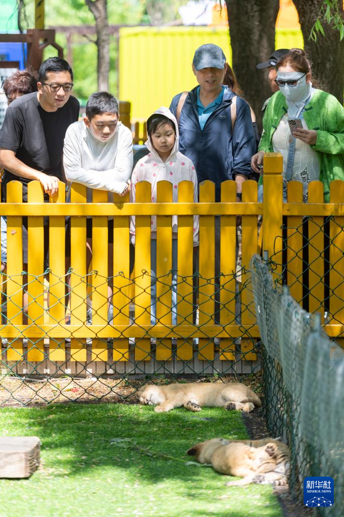 6月11日,游客在黑龙江东北虎林园看着熟睡的东北虎幼虎和非洲狮幼狮。