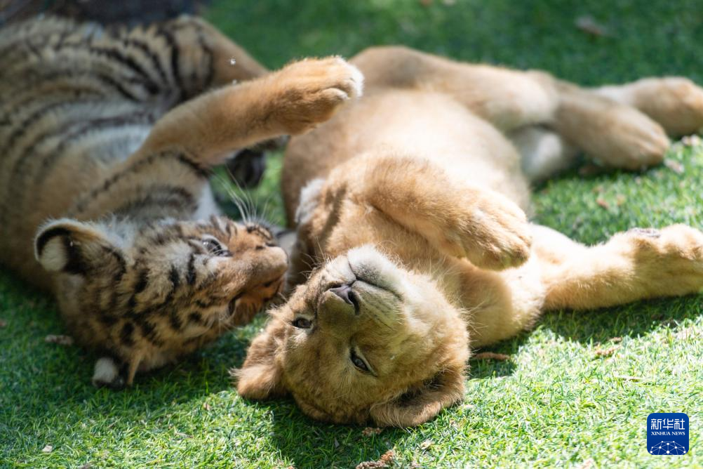 6月11日,在黑龙江东北虎林园,东北虎幼虎(左)和非洲狮幼狮一起玩耍。
