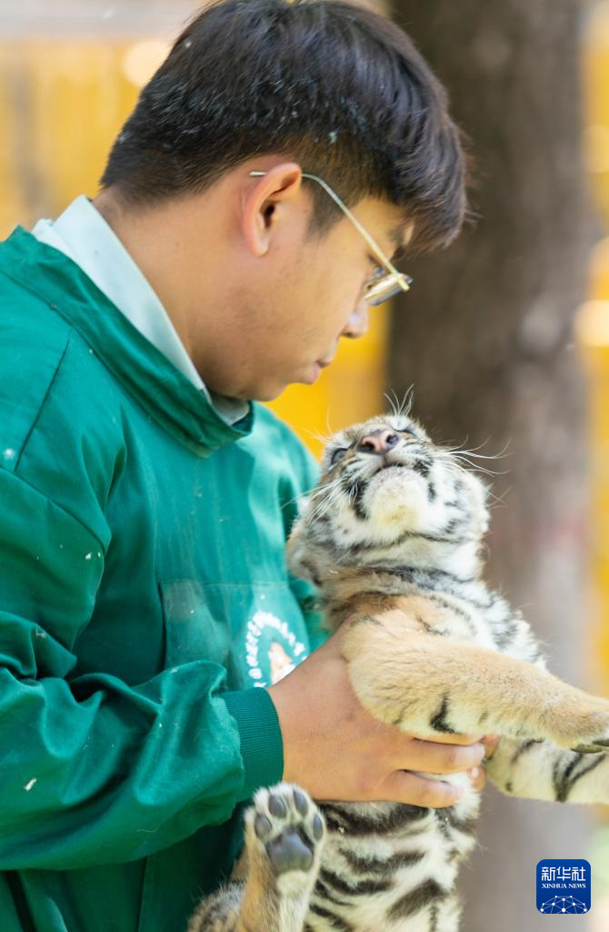 6月11日,在黑龙江东北虎林园,一只东北虎幼虎被抱起时看向饲养员。