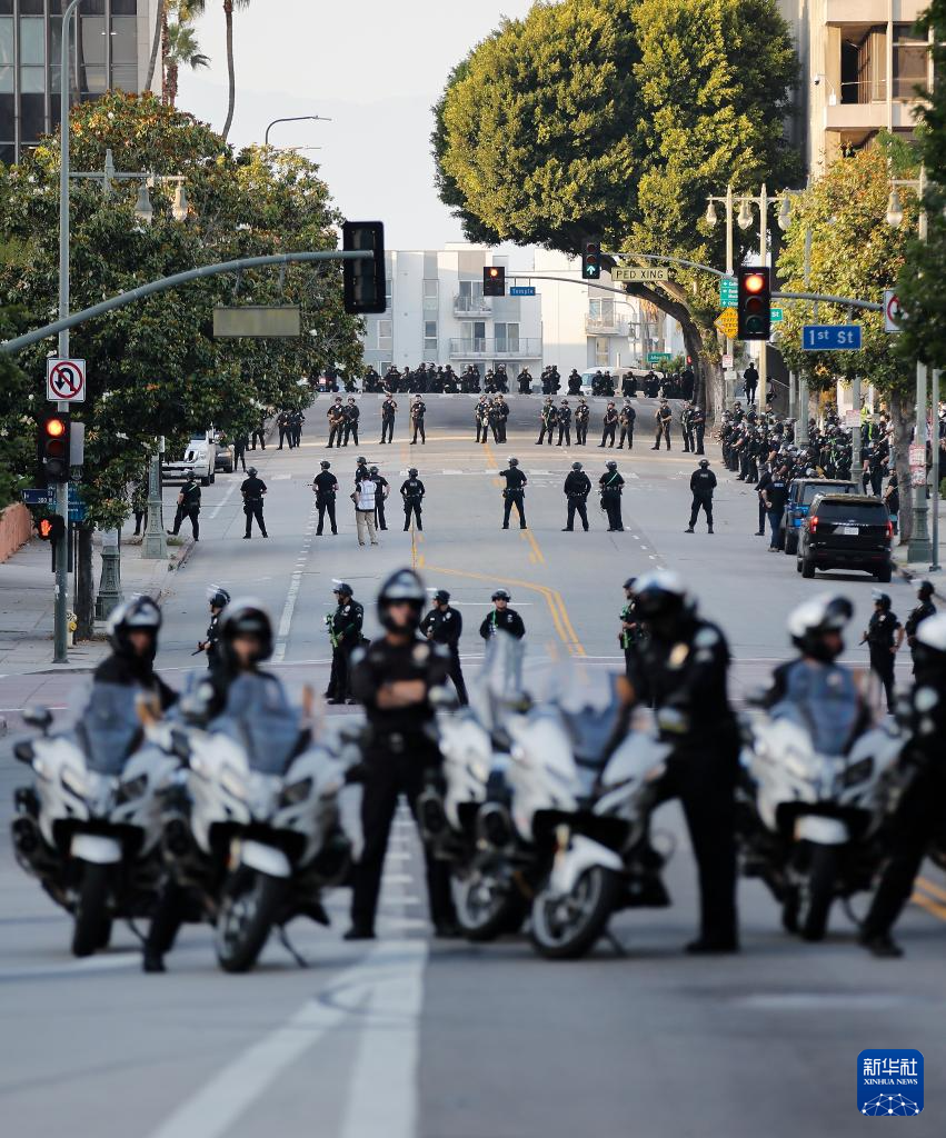 6月11日,警察在美国洛杉矶市中心执勤。