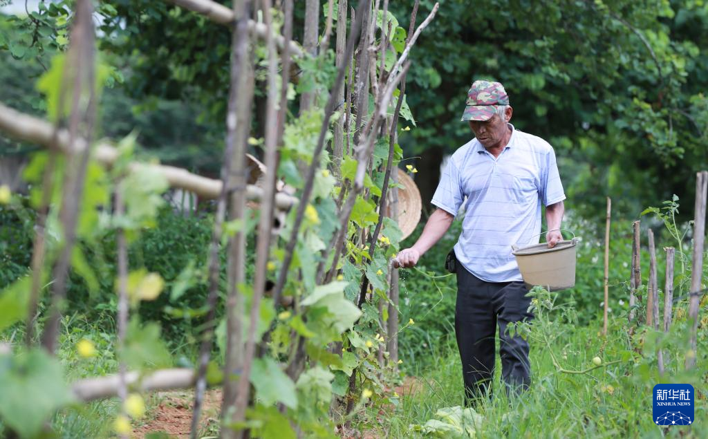 6月10日,仙溪村的老人在长者食堂的菜园里给蔬菜施肥。菜园利用村委会提供的集体土地,由老人们种植各种时令蔬菜以降低用餐成本。