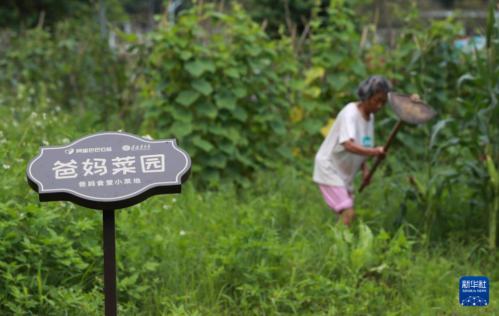 6月10日,仙溪村的老人在长者食堂的菜园里锄草。菜园利用村委会提供的集体土地,由老人们种植各种时令蔬菜以降低用餐成本。