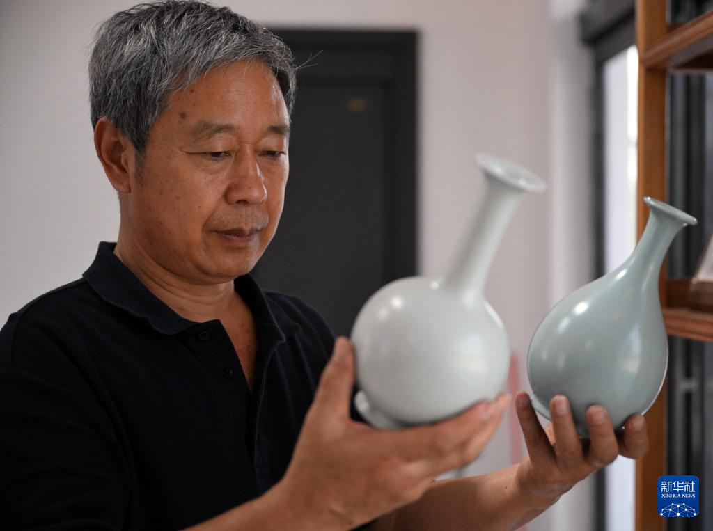 5月28日,汝瓷艺人王国奇在对比汝瓷釉色。