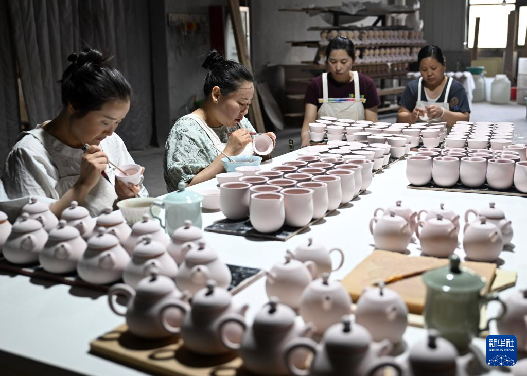 5月29日,宝丰县一家汝瓷企业的工人在修釉。