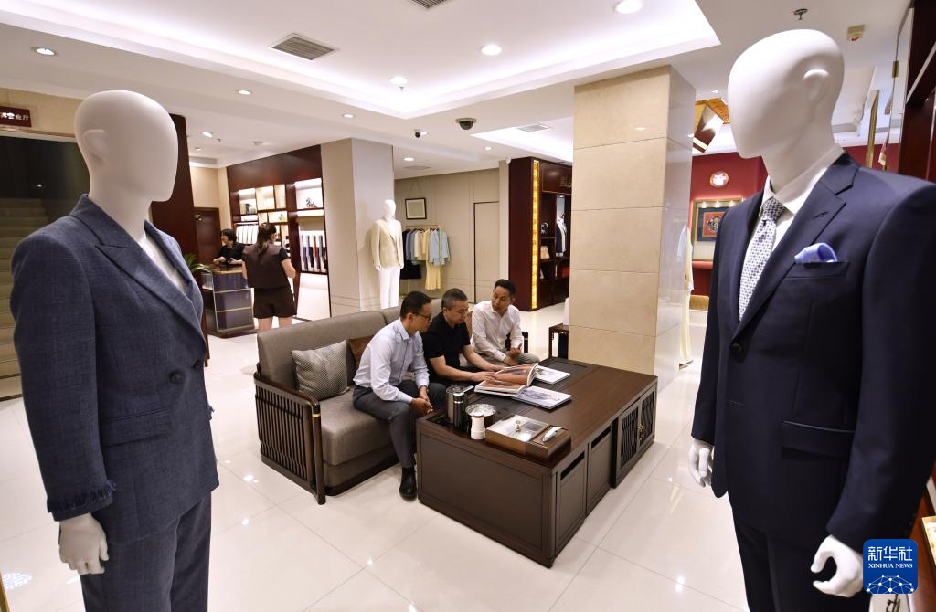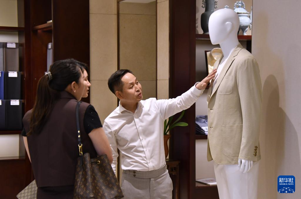 6月10日,顾客在隆庆祥总店内了解定制西装制作流程。
