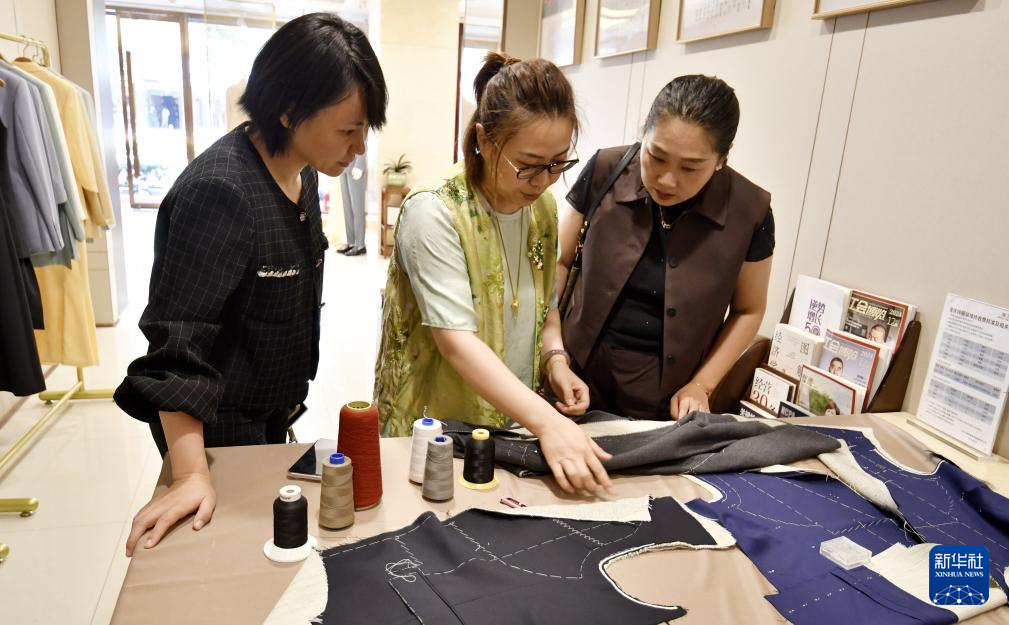 6月10日,“隆庆祥传统西装制作技艺”非遗项目代表性传承人李伟(左)和同事研究定制西装的缝制技艺。