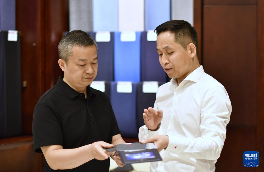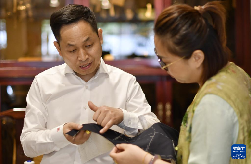 6月10日,“隆庆祥传统西装制作技艺”非遗项目代表性传承人李伟(右)为顾客介绍布料。