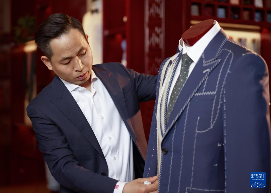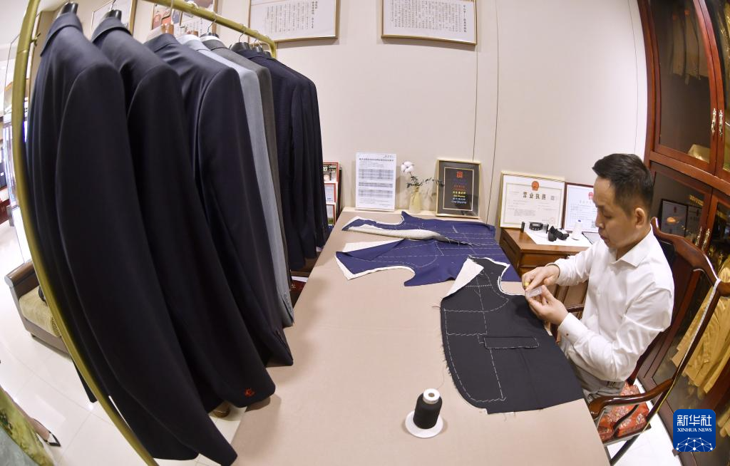 6月10日,“隆庆祥传统西装制作技艺”非遗项目代表性传承人李伟在修改定制西装。