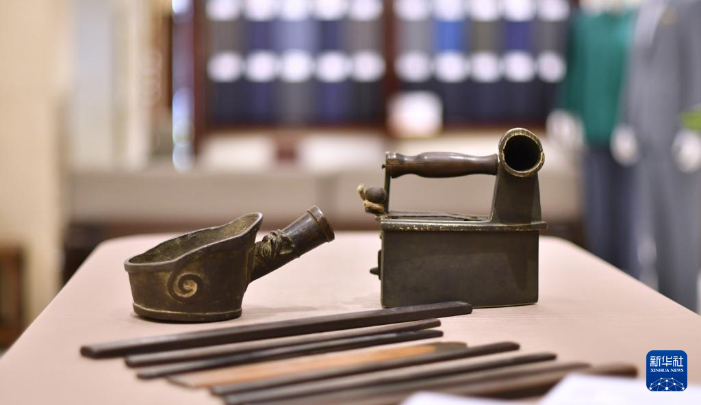 这是位于北京王府井商圈内的隆庆祥总店内展示的服装制作老工具(6月10日摄)。