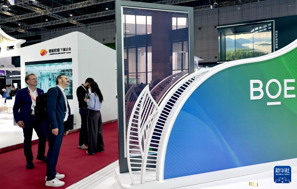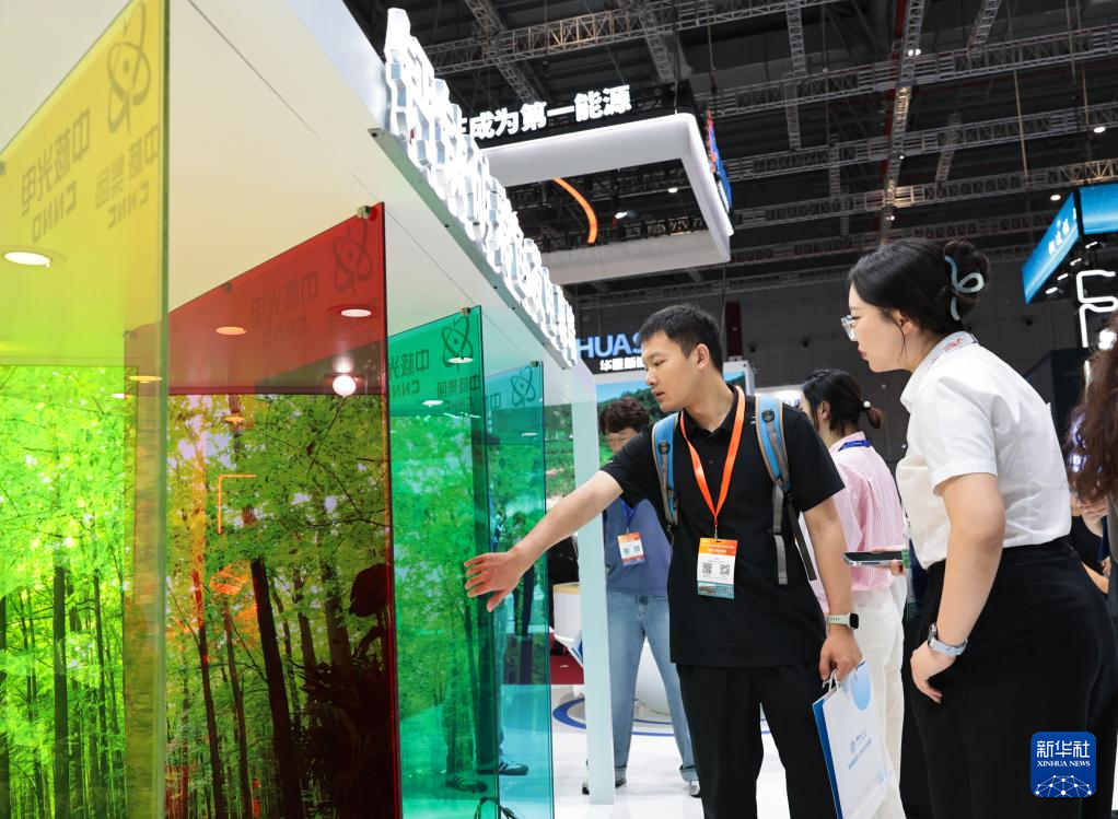 6月12日,参观者在一组钙钛矿彩色发电幕墙展品旁驻足观看。