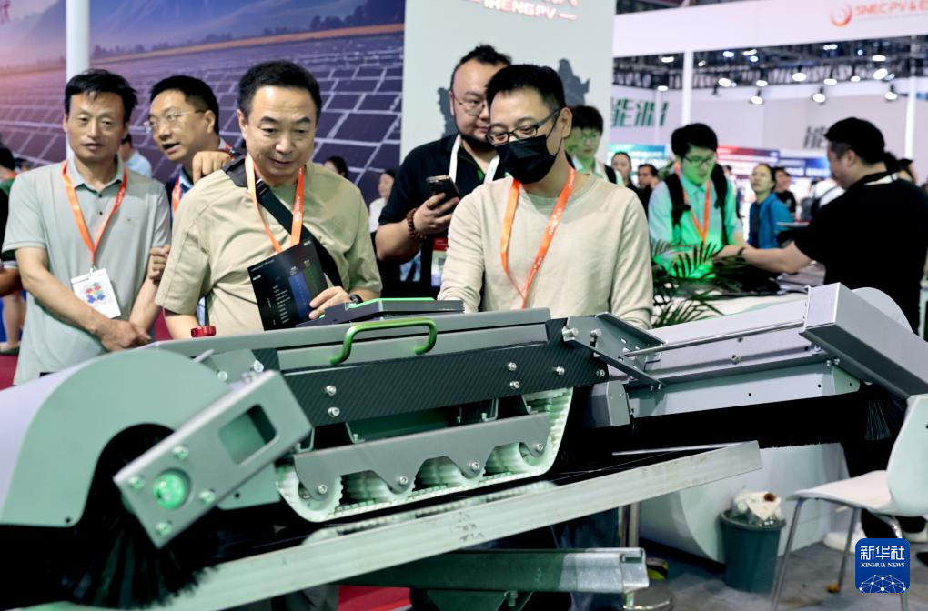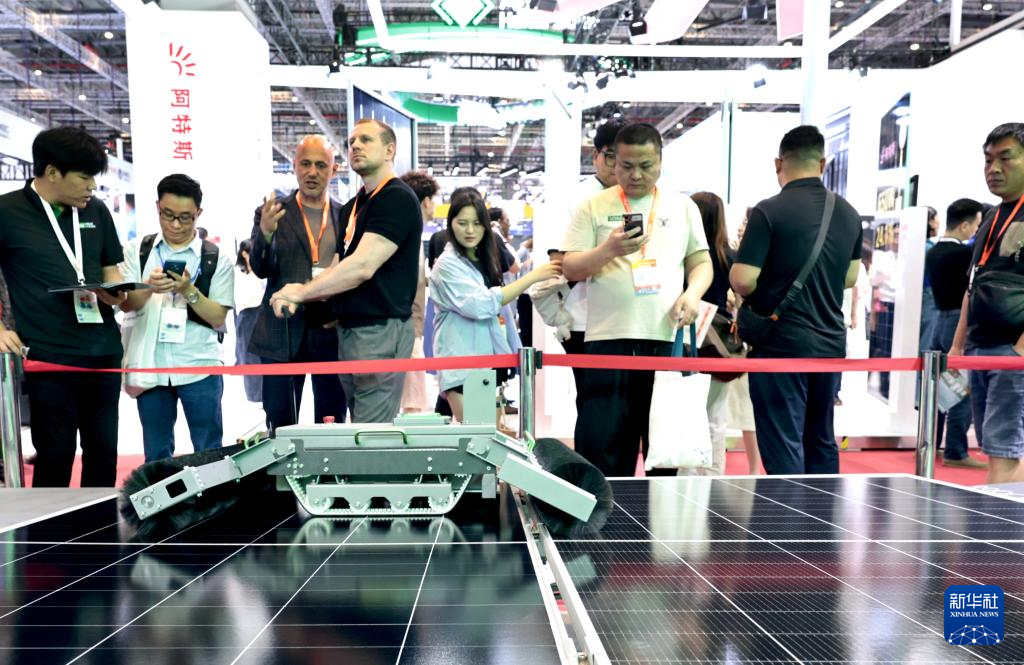 6月12日,参观者在展会现场观看全自动光伏清洁机器人进行作业演示。