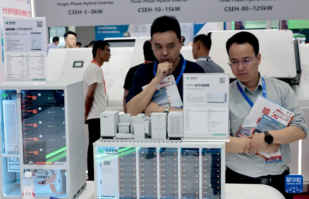 6月12日,参观者在一个储能解决方案展品前交流讨论。