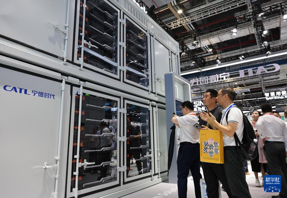 6月12日,参观者在一组储能设备模型展品前驻足观看。