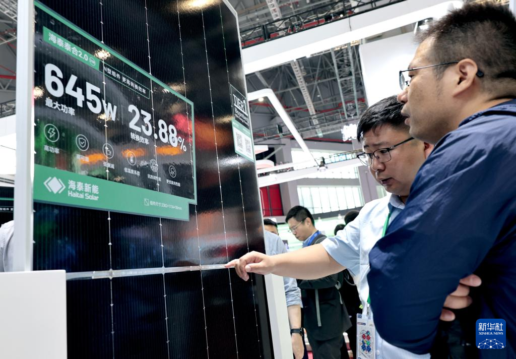 6月12日,参观者在一个506W钙钛矿光伏组件旁驻足观看。