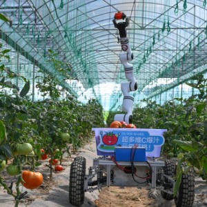 6月12日,重庆璧山番茄小镇·果琳基地内,机器人自动摘取成熟的番茄。